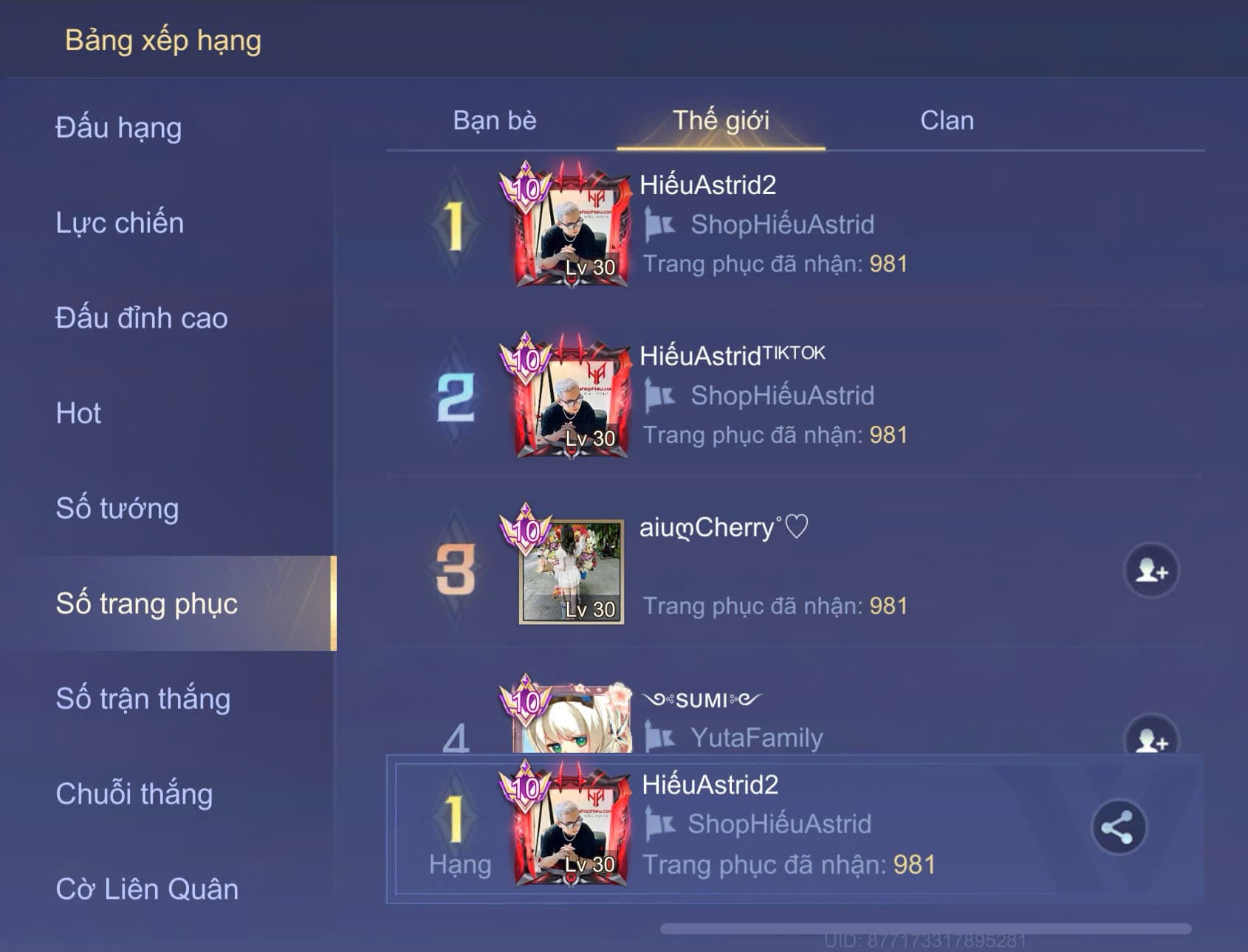 Top 1 Bảng xếp hạng trang phục Liên Quân